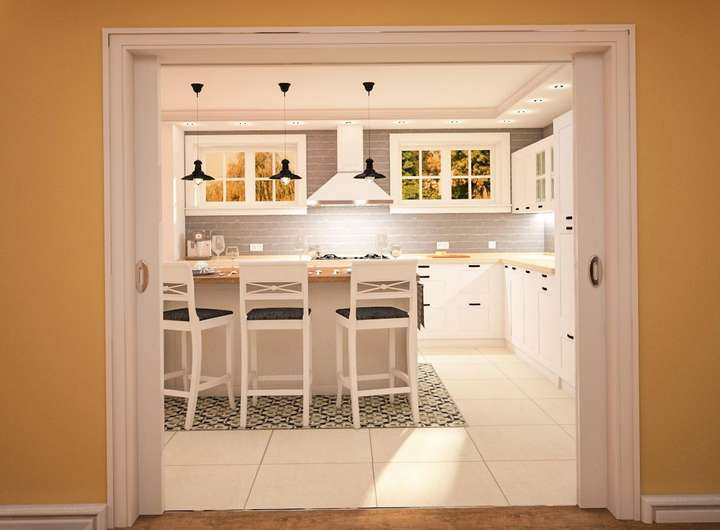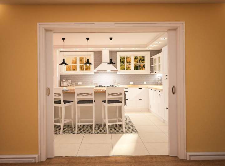 - Wohnzimmer und eine große küche mit einer Schiebetür, um die Küche vom Wohnzimmer abzugrenzen. Beide Zimmer haben einen Blick auf den schönen Garten.