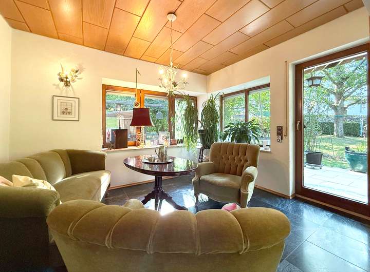 Der Hauptteil des Hauses umfasst 5 Zimmer, die sich auf 2 Etagen verteilen. Hervorzuheben sind neben den 3 Schlafzimmern die Küche plus praktischer Speisekammer sowie der sehr große Wohn-Essbereich, von dem man auf die nach Süden ausgerichtete Terrasse gelangt. Im Sommer lässt sich hier der Garten perfekt im Schatten der Bäume genießen. Selbstverständlich verfügt das Haus auch über ein geräumiges Badezimmer sowie ein zusätzliches Gäste-WC mit Dusche - praktisch für Familien und Besucher gleichermaßen.