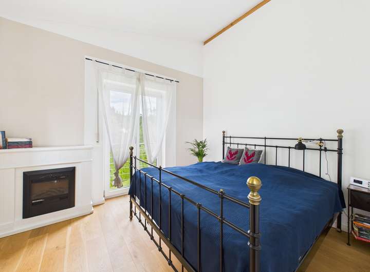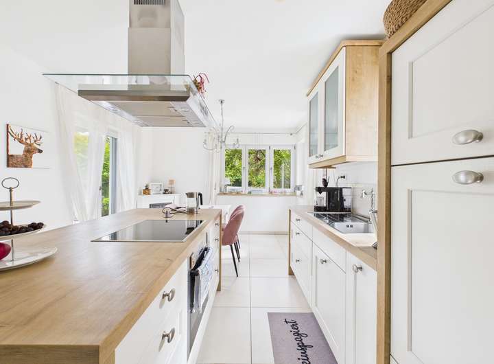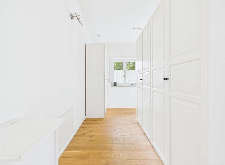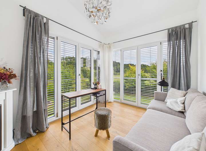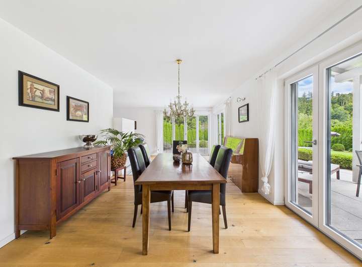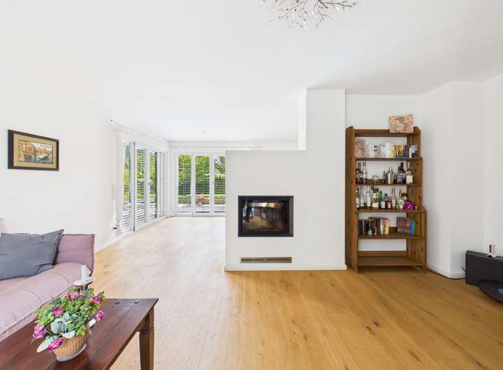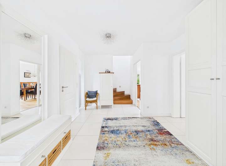 Bereits beim Betreten spürt man die besondere Atmosphäre: klare Linien, eine ausgesprochen gelungene Raumaufteilung und lichtdurchflutete Räume, die durch hochwertiges Eichenparkett und edle Fliesenböden veredelt werden. Großzügige Fensterfronten öffnen den Blick in den parkähnlichen, uneinsichtigen Garten, der absolute Privatsphäre und eine unverbaubare Sicht bietet – eine grüne Oase, die direkt an ein wunderschönes Naturschutzgebiet grenzt. Jahrhundertealte Eichen prägen das Panorama, das Sie sowohl vom Wohnzimmer als auch vom Schlafzimmer aus genießen können.