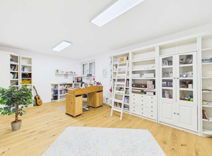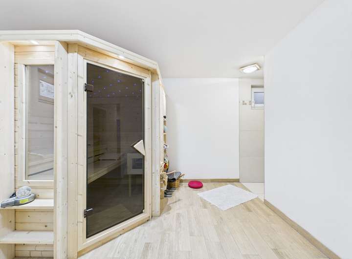Im Untergeschoss erwartet Sie ein hochwertig gestalteter Wellnessbereich mit exklusiver Bio-Dampfsauna – der ideale Rückzugsort für erholsame Stunden. Auch die wohnlich ausgebauten Kellerräume mit Fußbodenheizung bieten zusätzliche Flächen, die über reine Nutzräume weit hinausgehen.