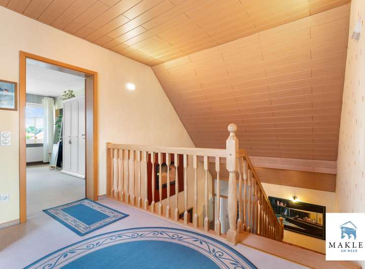 Dann öffnet sich der Flur – und mit ihm der Blick nach oben. Die offene Galerie, das lichtdurchflutete Treppenhaus, die Raumhöhe: All das verleiht dem Haus eine angenehme Großzügigkeit, die nie kühl wirkt, sondern einladend.