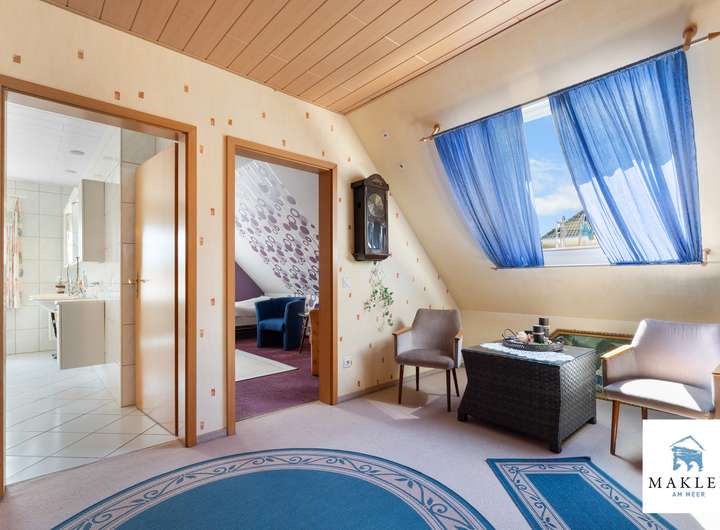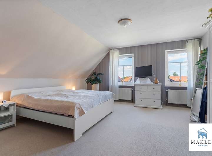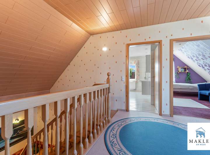 Oben geht es ruhig weiter: Ein großzügiges Schlafzimmer bietet Platz zum Ausbreiten, zum Ausschlafen, zum Wohlfühlen. Ein zweites Zimmer eignet sich als Kinderzimmer, Arbeitsbereich oder Raum für Gäste. Das Badezimmer ist in einem warmen Cremeton gehalten und mit Dusche, Wanne, zwei Handwaschbecken und WC ausgestattet – gepflegt, einladend und zeitlos schön.