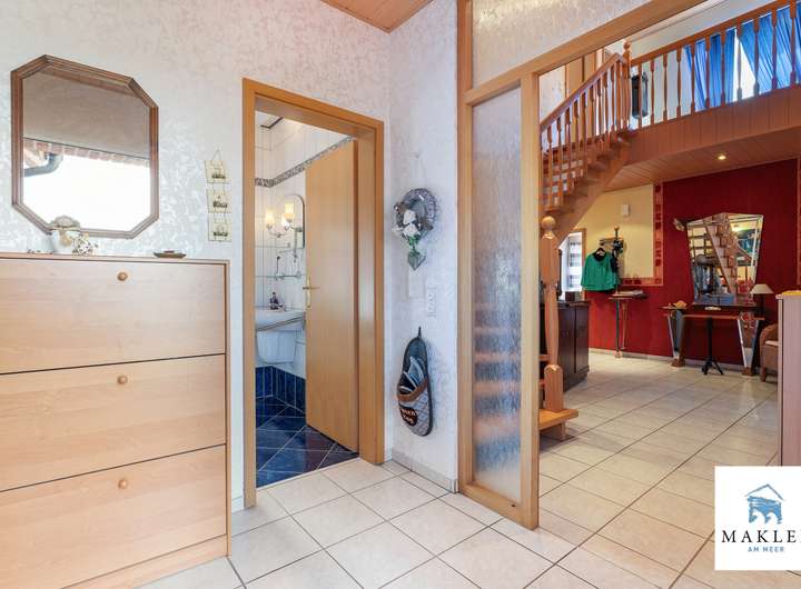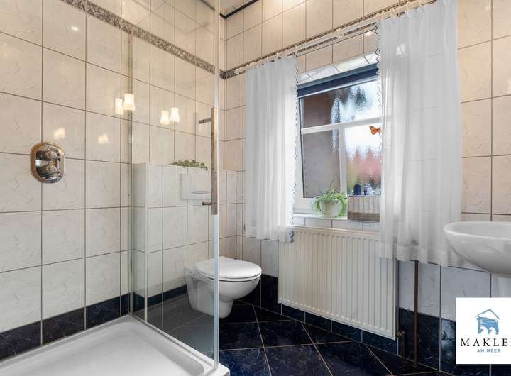 Schon der Eingangsbereich macht Eindruck – nicht mit Prunk, sondern mit Sinn. Der Windfang sorgt dafür, dass Gäste nicht gleich im Flur stehen und der Alltag draußen bleiben kann. Besonders praktisch: Wer mit dem Auto in die Garage fährt, kommt über den Windfang direkt ins Haus. Ein modernes Duschbad mit weißen Fliesen und blauen Akzenten ergänzt diesen Bereich.