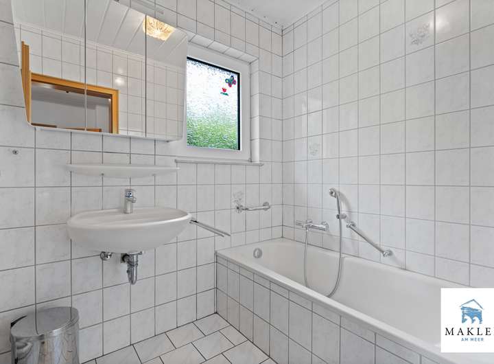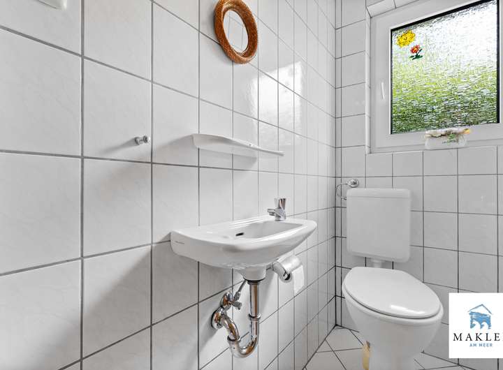 Im hinteren Flurbereich befinden sich ein separates Gäste-WC mit Handwaschbecken sowie ein Badezimmer mit Badewanne und Waschbecken – klassisch aufgeteilt, ganz ohne Umwege. Auch der Teilkeller ist von hier zugänglich. Zwei kleinere Räume bieten Platz für Vorräte – und beherbergen zudem die Heizungstherme.