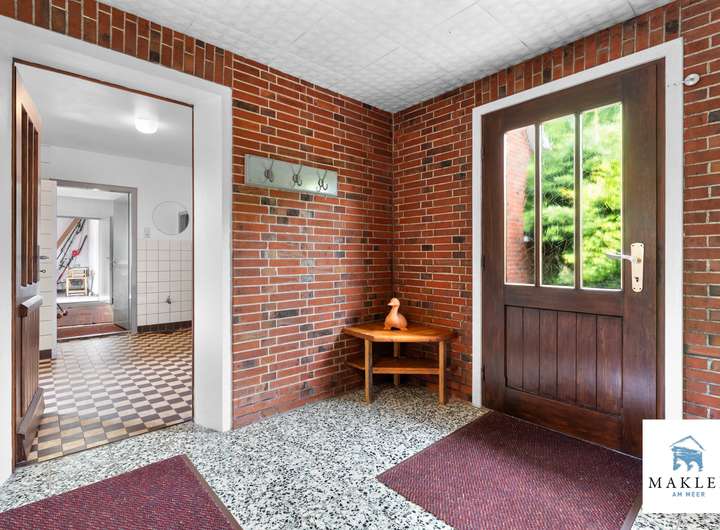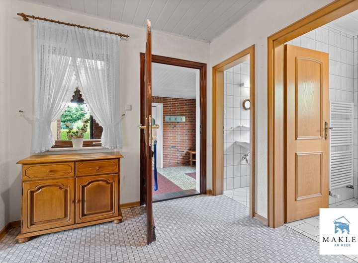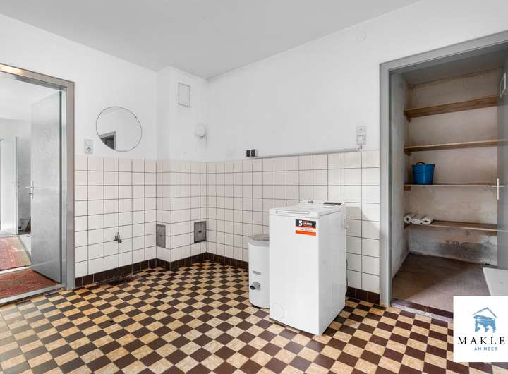 Eine Stufe tiefer eröffnet sich der Zugang zum Zwischenbau – mit direktem Zugang auf die überdachte Terrasse und in den Garten. Wer hinter dem Haus parkt, betritt das Haus hier ganz praktisch über den Nebeneingang. Der anschließende Anbau wurde 1969 massiv errichtet und erweitert das Raumangebot erheblich: Ein großzügiger Hauswirtschaftsraum mit Anschlüssen für Waschmaschine und Trockner, sowie bodengleicher Dusche bildet den Auftakt.