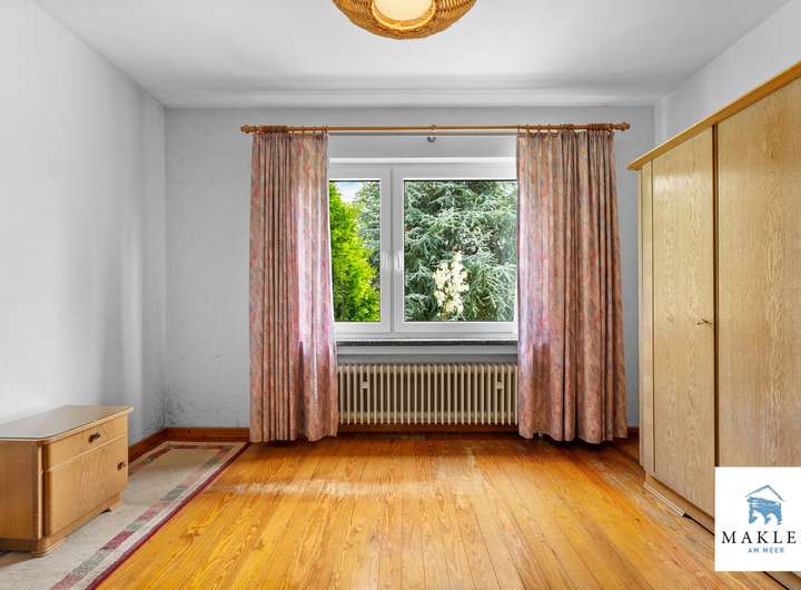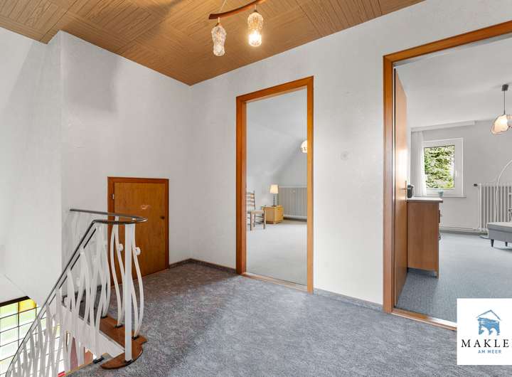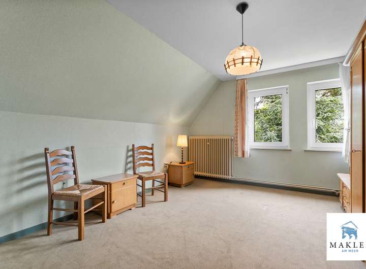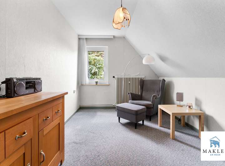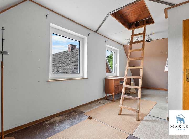 Im Obergeschoss des Haupthauses warten drei weitere Zimmer auf Ihre Ideen. Besonders hervorzuheben ist das Giebelzimmer – ein heller, ruhiger Raum mit Zugang zum darüberliegenden Spitzboden, der sich perspektivisch auch für eine Erweiterung oder einen Ausbau anbietet. Ob Stauraum, Rückzugsnische oder Dachstübchen – wer hier gestalten möchte, hat alle Möglichkeiten. Auch der Einbau eines zweiten Badezimmers wäre hier denkbar.