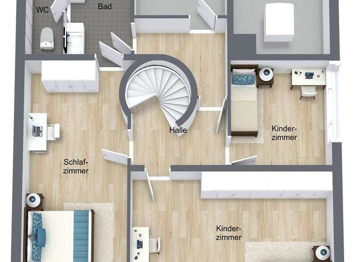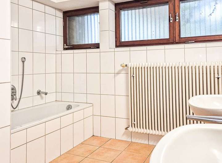 Im Untergeschoss des Hauses befinden sich weitere Räumlichkeiten, darunter ein Kellerraum und der Heizraum, die zusätzlichen Stauraum bieten und die technischen Einrichtungen des Hauses beherbergen. Ein Bad mit WC bietet Komfort und Funktionalität. Drei Schlafzimmer, darunter zwei Kinderzimmer und ein Hauptschlafzimmer, bieten Platz für die gesamte Familie. Vom Schlafzimmer aus gelangt man auf eine gemütliche Terrasse, die sich ideal für erholsame Stunden im Freien eignet und einen herrlichen Blick auf den weitläufigen Garten bietet.