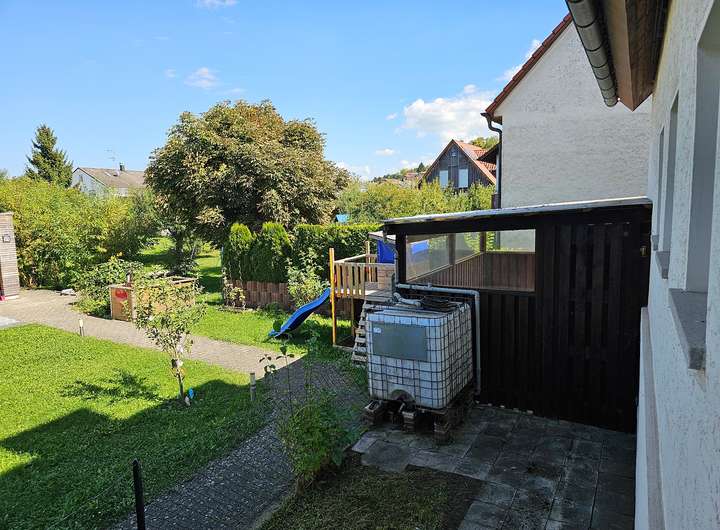 Auf der Südseite vor dem Haus befindet sich eine Rasenfläche, welche jedoch neu angelegt werden sollte. Hinter dem Haus, neben der Pergola ist ebenfalls eine kleine Rasenfläche sowie ein Holzschuppen.