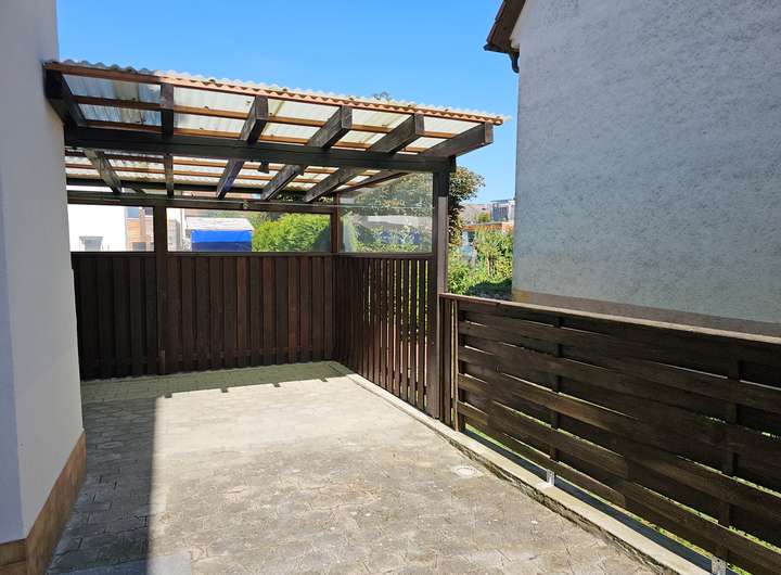 Neben dem Haupteingang haben Sie eine gemütliche überdachte Terrasse/Pergola auf der Sie den Abend allein oder im Beisein von Freunden ausklingen lassen.