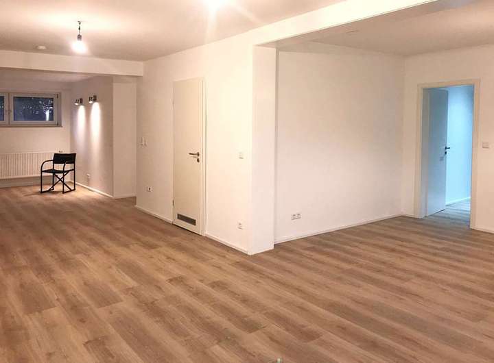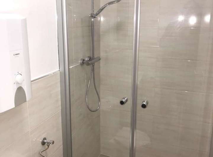Dieser Bereich wurde erst vor wenigen Jahren modernisiert und erhielt unter anderem ein neues Bad. Und eine moderne Einbauküche. In diesem Zusammenhang wurde auch der direkte Zugang von der Hauptwohnung in den unteren Bereich geschlossen. Der Bereich besteht aus zwei Zimmern, einem Abstellraum, dem Bad und der Küche. Von hier aus gelangt man in den Kellerbereich und zur Fernwärmestation. Von hier aus geht es in den Garten.