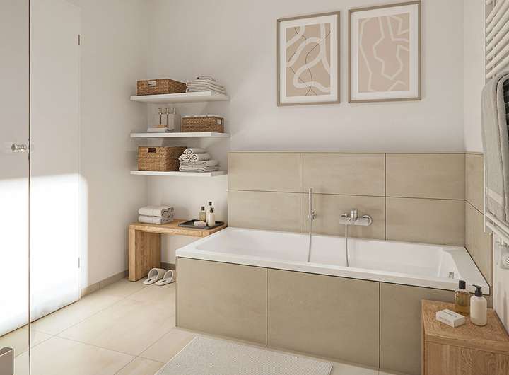 Insgesamt verfügen die Häuser über 5,5 Zimmer – darunter ein offener, heller Wohn- und Essbereich im Erdgeschoss mit direktem Zugang zur Terrasse und dem eigenen Garten. Die offene Küche schafft eine moderne, kommunikative Wohnatmosphäre und kann individuell geplant und separat erworben werden, sodass Sie Ihre persönlichen Wünsche und Vorstellungen perfekt umsetzen können. Bodentiefe Fenster sorgen für viel Tageslicht und eine nahtlose Verbindung zwischen Innen- und Außenbereich.