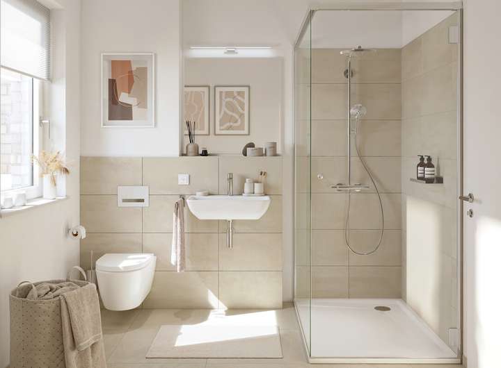 - Badezimmer mit bodengleicher Dusche und Badewanne