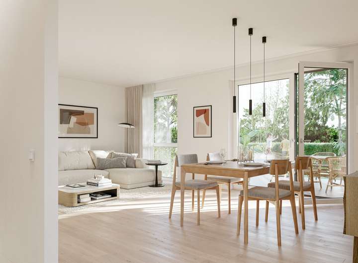 Insgesamt verfügen die Häuser über 5,5 Zimmer – darunter ein offener, heller Wohn- und Essbereich im Erdgeschoss mit direktem Zugang zur Terrasse und dem eigenen Garten. Die offene Küche schafft eine moderne, kommunikative Wohnatmosphäre und kann individuell geplant und separat erworben werden, sodass Sie Ihre persönlichen Wünsche und Vorstellungen perfekt umsetzen können. Bodentiefe Fenster sorgen für viel Tageslicht und eine nahtlose Verbindung zwischen Innen- und Außenbereich.