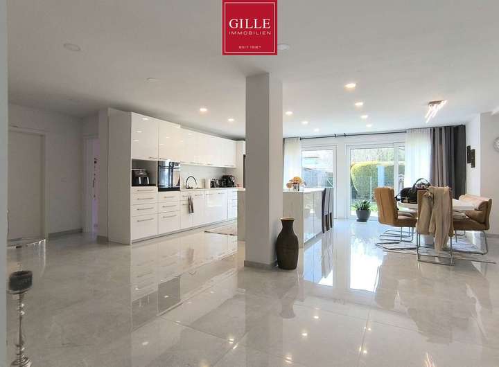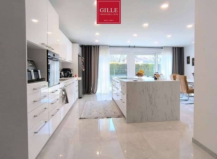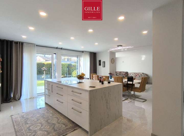Der offene Wohnbereich beeindruckt mit einer harmonischen Verbindung aus Design und Funktionalität. Die nahtlos integrierte, moderne Einbauküche mit hochwertigen Geräten und einer Kücheninsel bildet das Herzstück des Hauses und geht fließend in den stilvollen Essbereich über. Bodentiefe Fenster sorgen für eine helle und freundliche Wohnatmosphäre und eröffnen den Blick