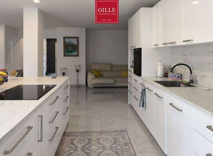 Der gesamte Wohnbereich ist mit edlen Marmorböden ausgestattet, während die Bäder mit stilvollen Marmorwänden veredelt wurden. Die moderne Einbauküche überzeugt durch eine großzügige Kücheninsel, die nicht nur als funktionaler Arbeitsbereich, sondern auch als geselliger Treffpunkt dient.