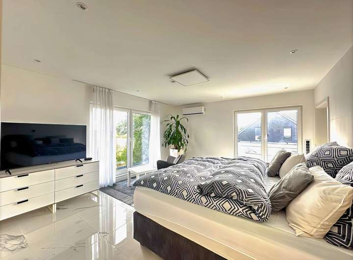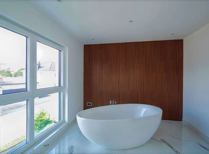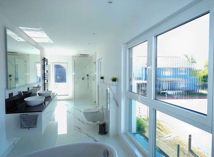 Im Obergeschoss erwartet Sie ein Masterbad, das einem Boutique-Hotel gleicht: Die freistehende Badewanne mit Ausblick, eine großzügige Walk-in-Dusche und hochwertige Armaturen machen Ihr Badezimmer zur täglichen Wellness-Oase.