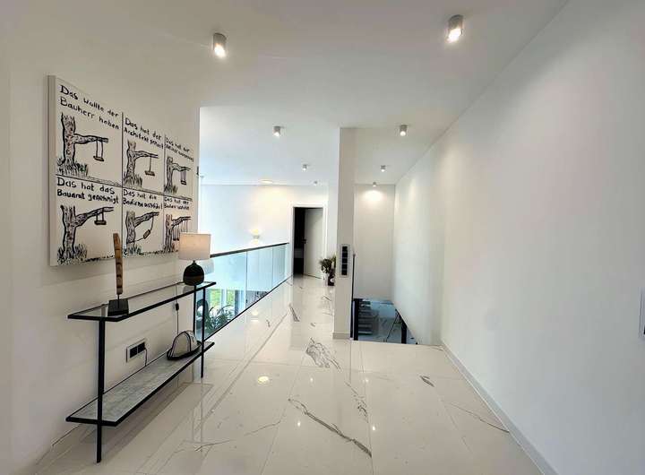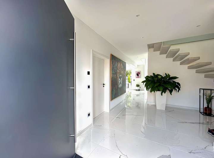 Bereits beim Betreten der Immobilie durch die großzügige Diele spüren Sie den hohen Anspruch an Qualität und Ästhetik. Der gesamte Wohnbereich ist mit hochwertigen, einheitlich verlegten Marmorböden ausgestattet, die nicht nur stilvoll wirken, sondern auch ein angenehmes Raumklima schaffen.