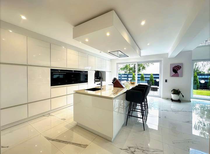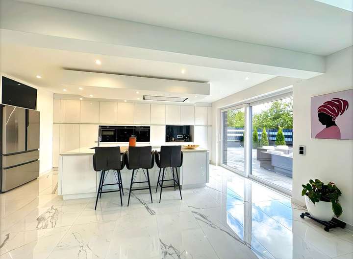 Die Design-Küche mit Kochinsel fügt sich perfekt in das offene Raumkonzept ein und lädt zum gemeinsamen Kochen und Verweilen ein. Hochwertige Geräte, viel Stauraum und edle Oberflächen machen sie zum Traum eines jeden Hobbykochs.