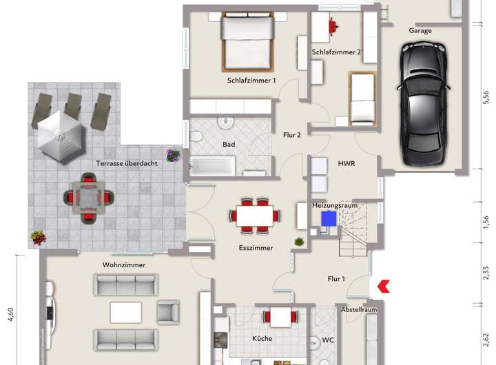 EG: Wohnzimmer, Esszimmer, 2 Schlafzimmer, Küche, Bad, Gäste-WC; HWR, Abstellraum, Heizungsraum, Flure, teilüberdachte Terrasse, Garage (mit Zugang zum Haus)