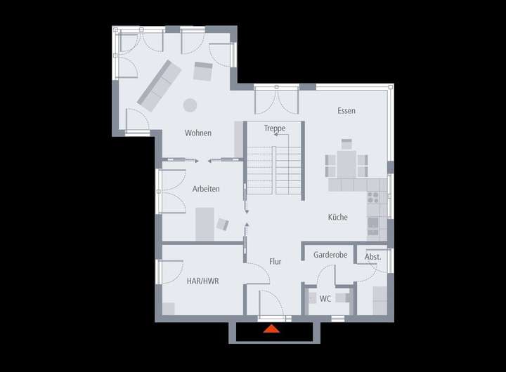 Zentraler Punkt des Hauses: die offene Treppe. Die Aufteilung in der oberen Etage bietet individuelle Nutzungsmöglichkeiten: Kinder, Büro, Hobby oder Gäste? Alles ist möglich! Der Balkon und das Schlafzimmer mit Ankleide und eigenem Bad runden das Angebot ab. Wer hier wohnt, lebt frei und unbeschwert.