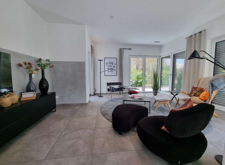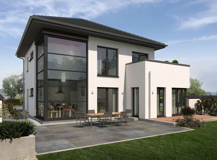 Die zweigeschossige Stadtvilla mit Zeltdach und Erker-Anbau präsentiert sich in schnörkellosem Design. Eyecatcher hier: die 5 Meter hohe Eck-Glasfront. Das Wohnkonzept steht für Offenheit und Transparenz und gewährt gleichzeitig ausreichend Privatsphäre.