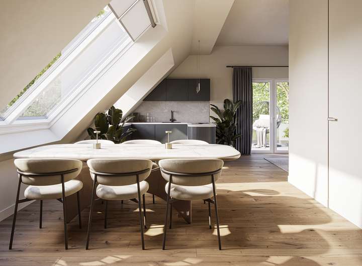 Bemerkenswert ist auch der kompakte und pfiffige Grundriss mit einem großen Wohn/Essbereich und offener Küche.