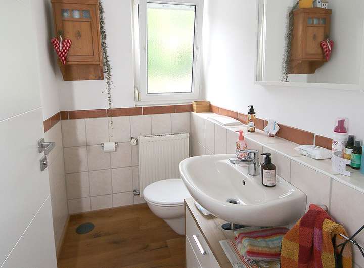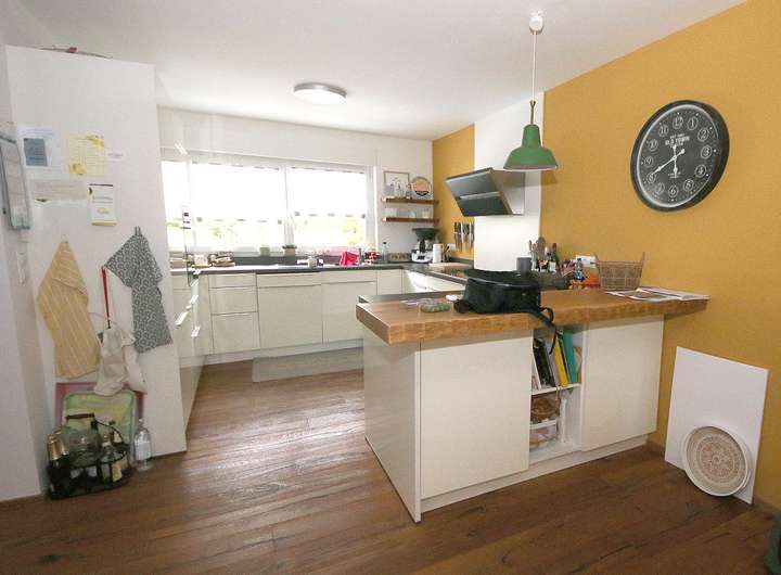 Die bestehende Ölheizung wurde durch eine nachträglich installierte Solartechnik mit 300-Liter-Warmwasserspeicher ergänzt und sorgt damit für zusätzliche Energieeffizienz und Nachhaltigkeit. Die moderne Einbauküche präsentiert sich in einem gepflegten Zustand und fügt sich harmonisch in das Gesamtbild des Hauses ein.
