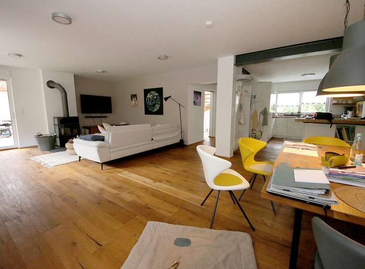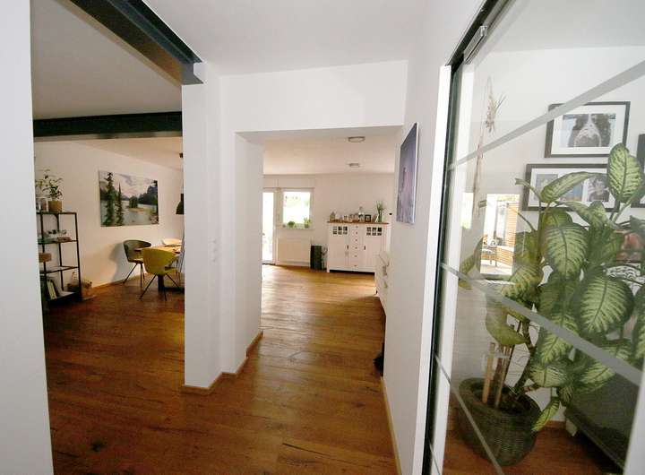 Große Fensterflächen lassen viel Tageslicht in die Räume und schaffen ein freundliches Ambiente. Die naturnahe Lage verbindet Ruhe und Erholung mit modernem Wohnkomfort – ideal für Familien, die Wohnqualität und Naturverbundenheit gleichermaßen schätzen.