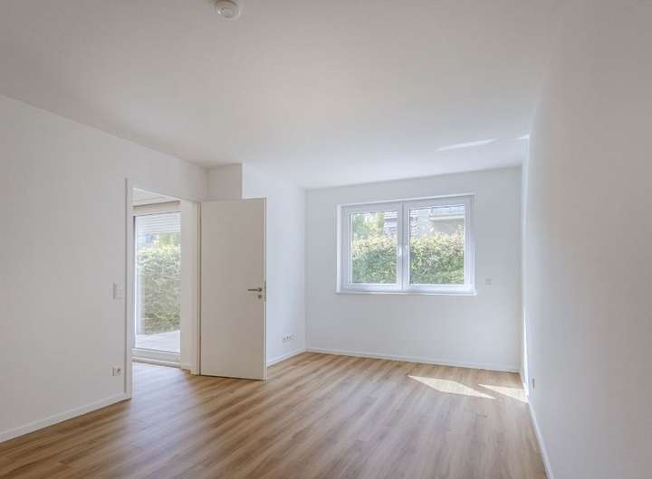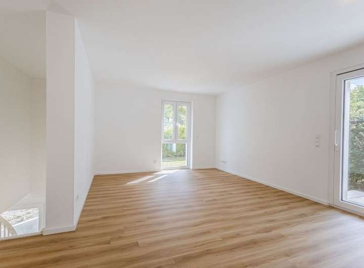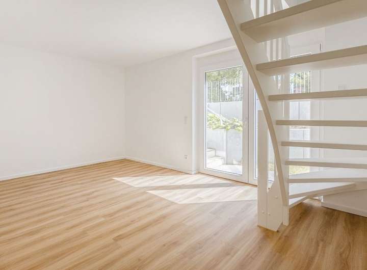 Das Obergeschoss bildet den zentralen Lebensmittelpunkt der Wohnung. Hier erwarten Sie ein lichtdurchfluteter Wohn- und Essbereich, ein weiteres Schlafzimmer, eine Küche sowie ein modernes Duschbad. Von der angrenzenden Terrasse aus führt eine Treppe direkt in den zur Wohnung gehörenden Garten mit exklusivem Sondernutzungsrecht. Dieser großzügige Außenbereich bietet vielfältige Möglichkeiten zur individuellen Gestaltung und schafft einen privaten Rückzugsort mit hohem Erholungswert.