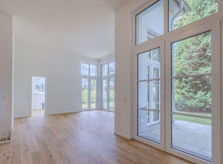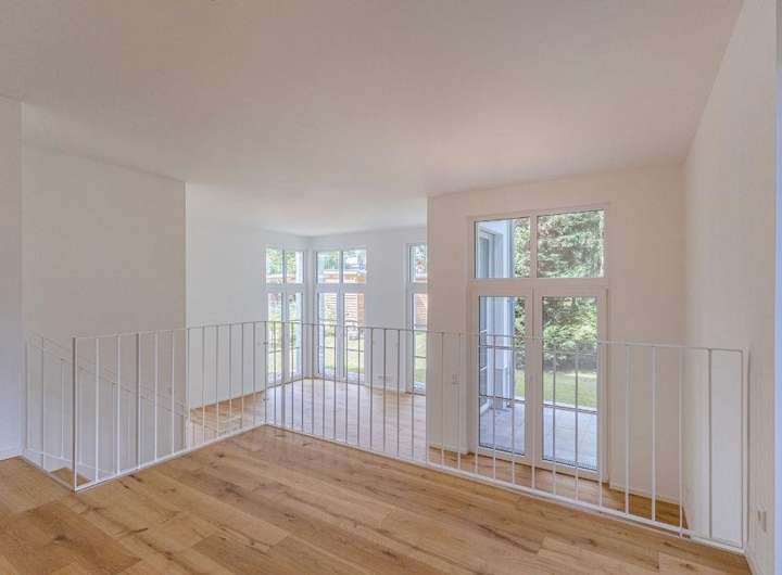 Das Erdgeschoss bildet das Herzstück der Wohnung. Eine einladende Diele führt zu einem Schlafzimmer mit östlicher Ausrichtung, einem modernen Duschbad sowie dem weitläufigen Wohn- und Essbereich, der durch seine offene Gestaltung und die große Fensterfront besonders hell und freundlich wirkt. Ein Highlight ist hier die Deckenhöhe von über drei Metern, die der Immobilie ihren einzigartigen Charme verleiht. Von hier aus gelangen Sie direkt auf die großzügige Terrasse mit Zugang zum Garten. Eine separate Küche sowie ein Arbeitsbereich auf der offenen Galerie, runden das Raumangebot dieser Ebene ab.