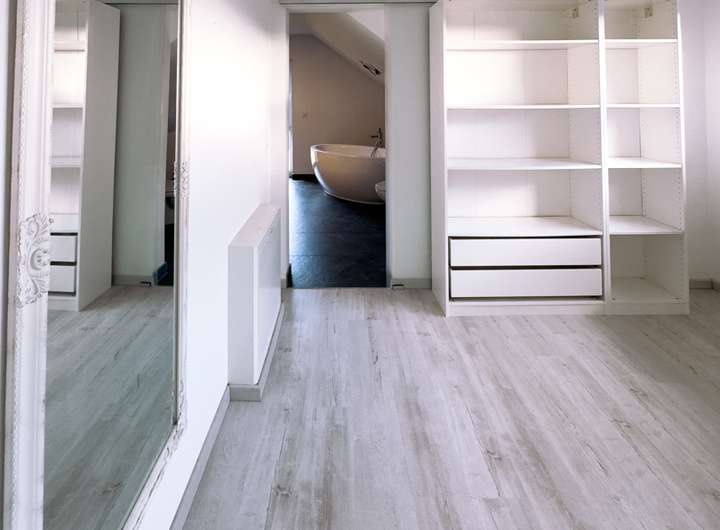 • Großformatige, graue Bodenfliesen