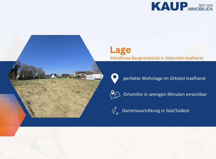 Das Grundstück liegt eingebettet in bestehende Wohnbebauung in guter, ruhiger Lage nur etwa 1 km vom Ortskern Isselhorst mit Nahversorger, Einzel-handelsgeschäften und Gastronomie entfernt- Öffentliche Einrichtungen, Schulen und Kindertageseinrichtungen sind tlw. in Isselhorst und darüber hinaus im Zentrum Gütersloh und den umliegenden Ortsteilen vorhanden. Die nächsten Bushaltestellen mit regelmäßiger Anbindung an´ das Zentrum Gütersloh und die Stadt Bielefeld liegen ca. 600 - 800 m entfernt an der Haller bzw. Isselhorster Straße. Die nächsten Auffahrten zur A 2 bzw. A 33 sind nach ca. 7 - 9 km zu erreichen.