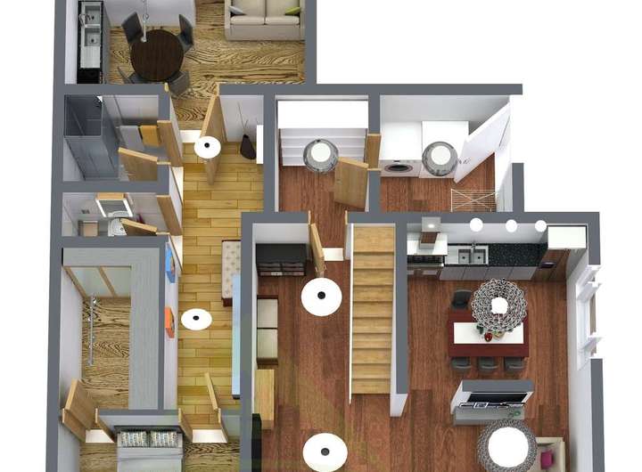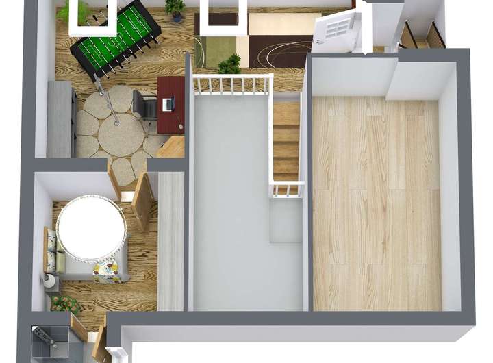 Das Hauptgebäude präsentiert sich auf drei Etagen mit insgesamt vier Zimmern und einem funktionalen Grundriss. Im Erdgeschoss erwartet Sie ein offener Wohn- und Essbereich mit angrenzender Küche, der sich durch große Fenster freundlich und hell zeigt. Das Tageslichtbad mit Duschwanne komplettiert das Erdgeschoss. Die Böden bestehen überwiegend aus Laminat und Fliesen.