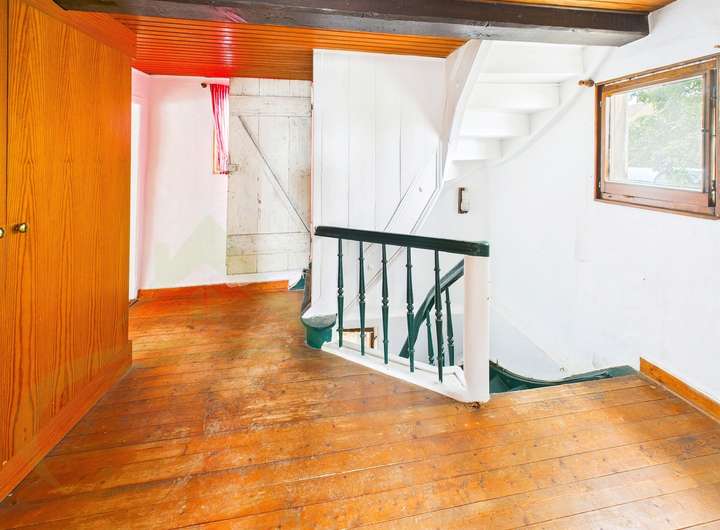 Im Obergeschoss befinden sich zwei Schlafzimmer sowie ein weiteres Zimmer, das sich ideal als Kinderzimmer oder Büro eignet. Das Dachgeschoss bietet zusätzliche Lagerfläche oder Ausbaupotenzial für kreative Nutzungsideen. Der Keller ist über eine charmante Holztreppe erreichbar und bietet reichlich Platz für Hobby, Werkstatt oder Vorräte.