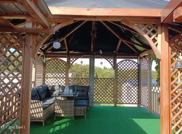 Mit dazugehörigem Geräteschuppen ca. 7m², Holz-Pavillon ca. 15m² mit Sitzgarnitur.