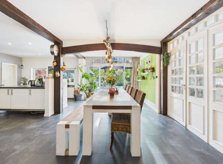 Lichtdurchfluteter Wohn- und Essbereich im Haupthaus mit Kamin und Zugang zur überdachten Terrasse; angrenzende offene Wohnküche mit Kochinsel und hochwertigen Einbaugeräten.