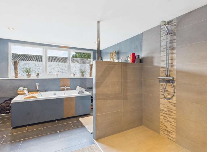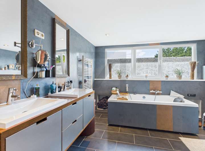 Luxuriöses Tageslichtbad im Haupthaus (Doppelwaschtisch, Badewanne, moderne Armaturen) sowie ein eigener Wellnessbereich mit Sauna.