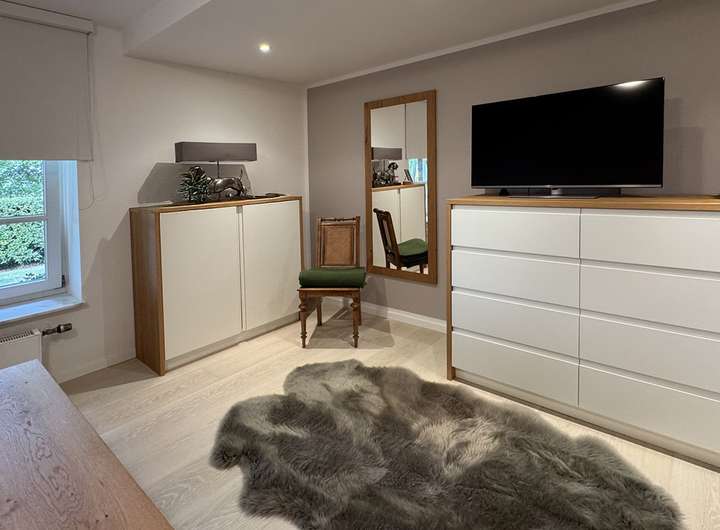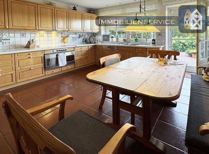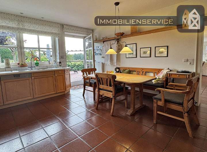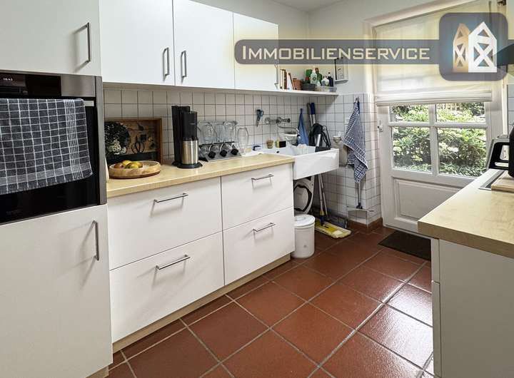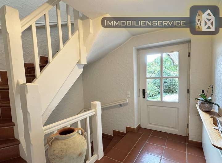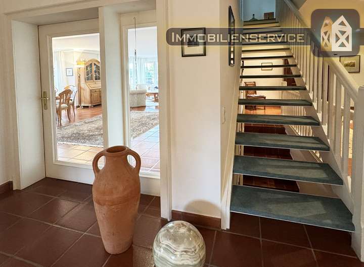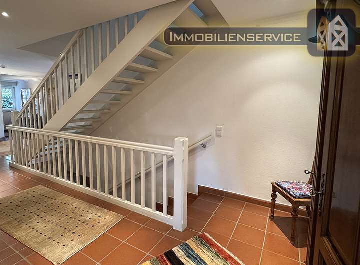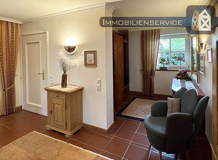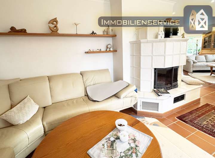 Die Innenräume sind von einer hochwertigen Materialwahl, einer durchdachten Raumgestaltung und einer gepflegten Ausstattung geprägt. Der offene Wohn- und Kaminbereich bildet das Herzstück des Hauses und vermittelt ein großzügiges Raumgefühl. Terracottafliesen, Parkettböden und hochwertige Teppiche wechseln sich in den verschiedenen Bereichen ab und verleihen den Räumen eine warme und zugleich elegante Atmosphäre. Massive Landhaustüren und Holzsprossenfenster unterstreichen den klassischen Charakter des Gebäudes, während die Fußbodenheizung im Erdgeschoss für zeitgemäßen Wohnkomfort sorgt.