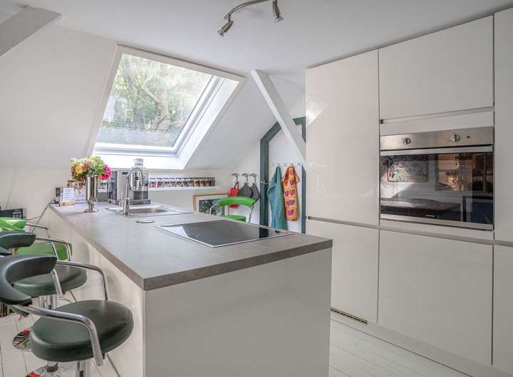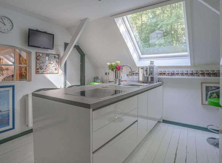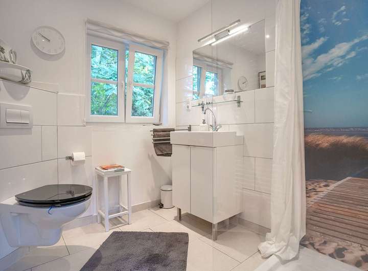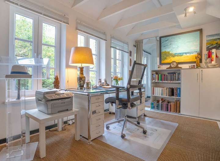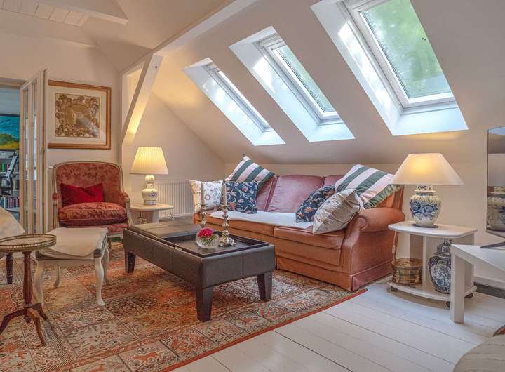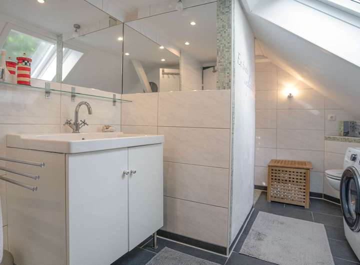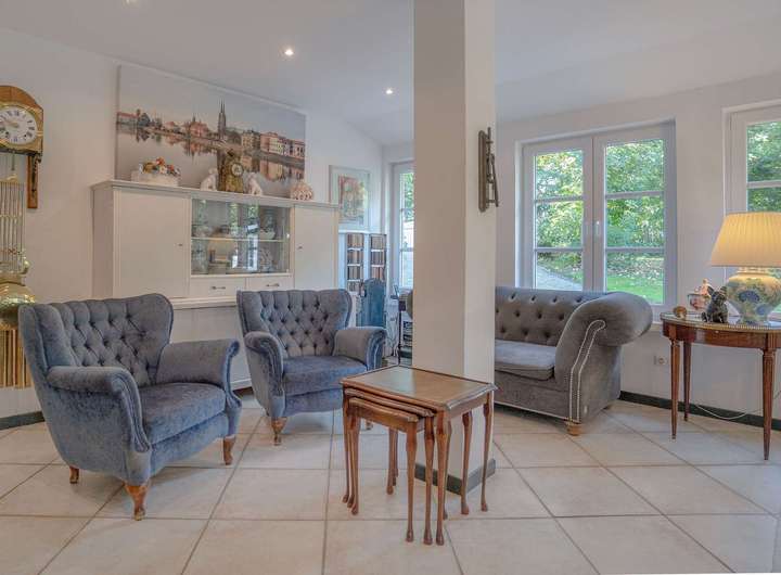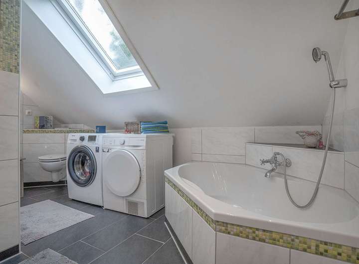 Das ebenerdige Wohnen im französischen Stil erfüllt höchste Ansprüche: Eine moderne Einbauküche mit zwei praktischen Abstellräumen in den Abseiten, zwei Tageslichtbäder – eines davon mit Wanne und ebenerdiger Dusche – sowie ein separates Gäste-WC mit Heizungsraum lassen keine Wünsche offen. Für Gäste steht ein einladendes Zimmer mit eigener kleiner Terrasse bereit, das Privatsphäre und Rückzugsmöglichkeiten bietet. Zudem ist das ausgebaute Dachgeschoss flexibel nutzbar, etwa als Galerie, Hobbyraum oder Spielparadies für Kinder.