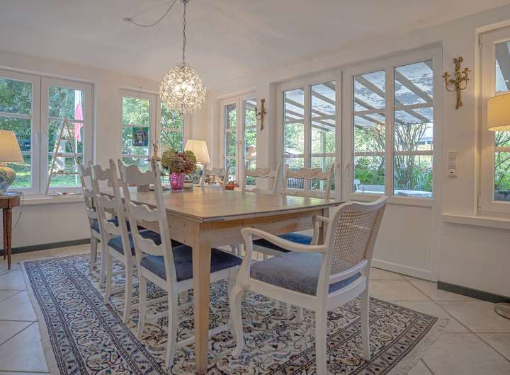 Schon beim Betreten offenbart sich die lichtdurchflutete Atmosphäre des Hauses: Zahlreiche Fenster lassen den Blick in die umliegende Natur schweifen und schenken den Räumen eine unvergleichliche Helligkeit. Sichtbare Holzbalken, stilechte Echtholz- und Natursteinböden sowie zwei Kaminöfen im Wohn- und Essbereich unterstreichen das gemütlich-elegante Ambiente. Der 2010 angefügte Wintergartenanbau erweitert den Wohn- und Essbereich um einen lichtdurchfluteten Raum mit direkter Verbindung in den Garten, während ein weiterer Anbau von 2017 zusätzliche Wohnfläche bietet – ideal nutzbar als Büro oder mögliche Einliegerwohnung, da bereits Küchenanschlüsse und ein Bad vorhanden sind.