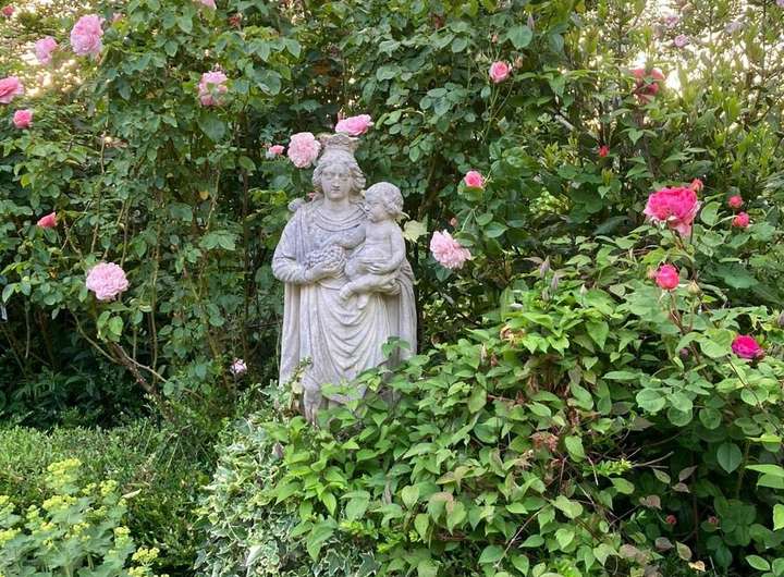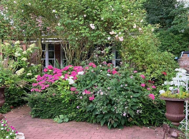 Ein besonderes Highlight stellt die großzügige Außenanlage dar: Auf rund 1.441 m² entfaltet sich eine liebevoll angelegte Gartenlandschaft, die über 70 verschiedene Rosenarten und zahlreiche prachtvolle Hortensien beherbergt. Verschlungene Wege, geschützte Terrassenbereiche – teils überdacht – sowie ein idyllisches Gartenhäuschen schaffen eine Oase der Ruhe und laden zum Verweilen ein. Zwei Zufahrten mit Toren ermöglichen eine komfortable Erschließung, während das eingewachsene Grundstück ein Höchstmaß an Privatsphäre bietet.