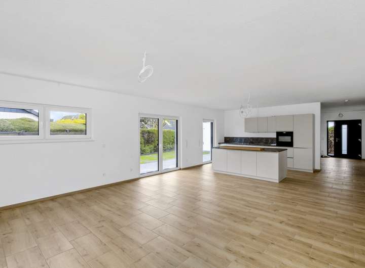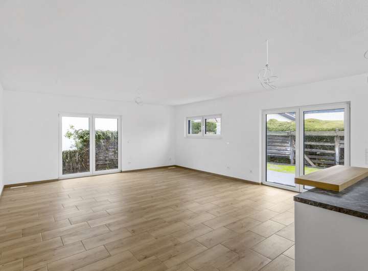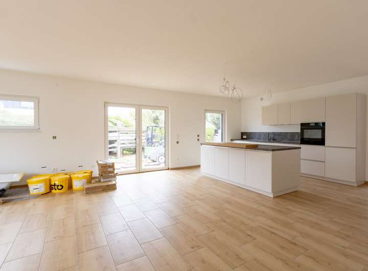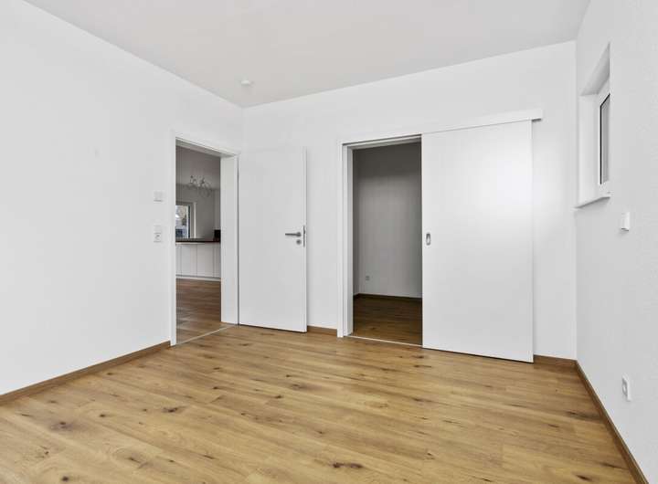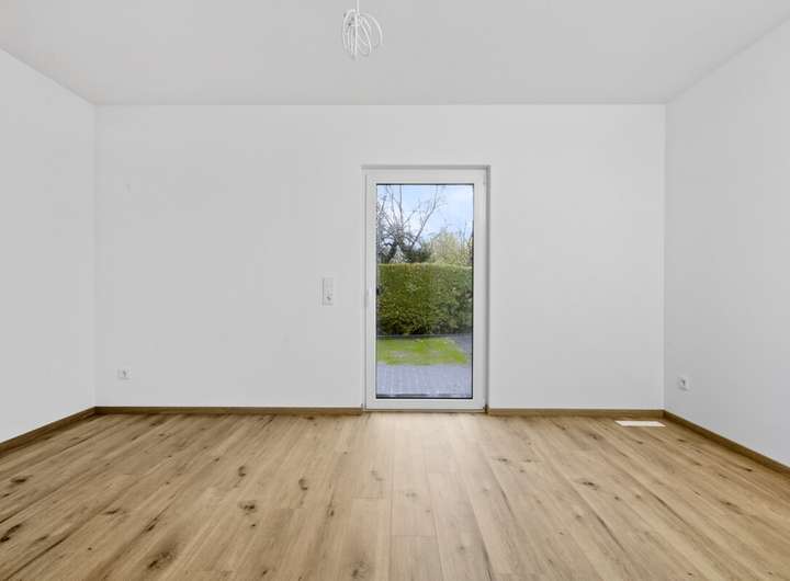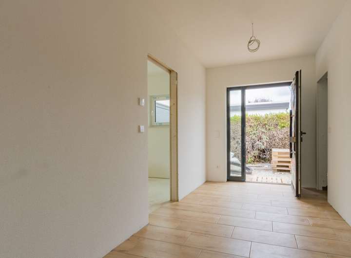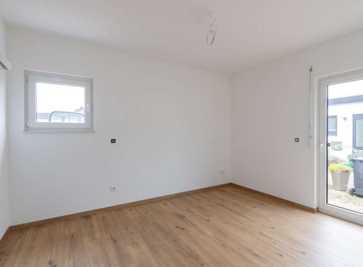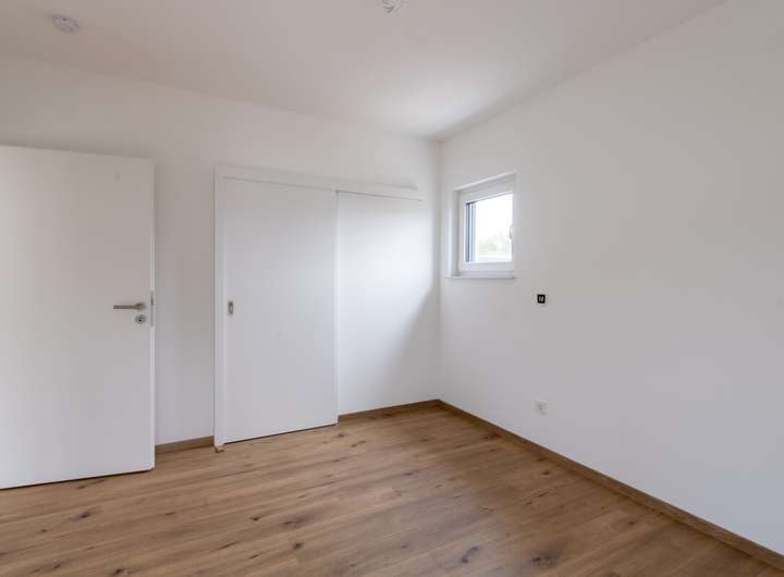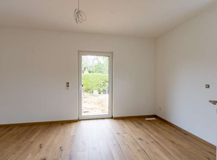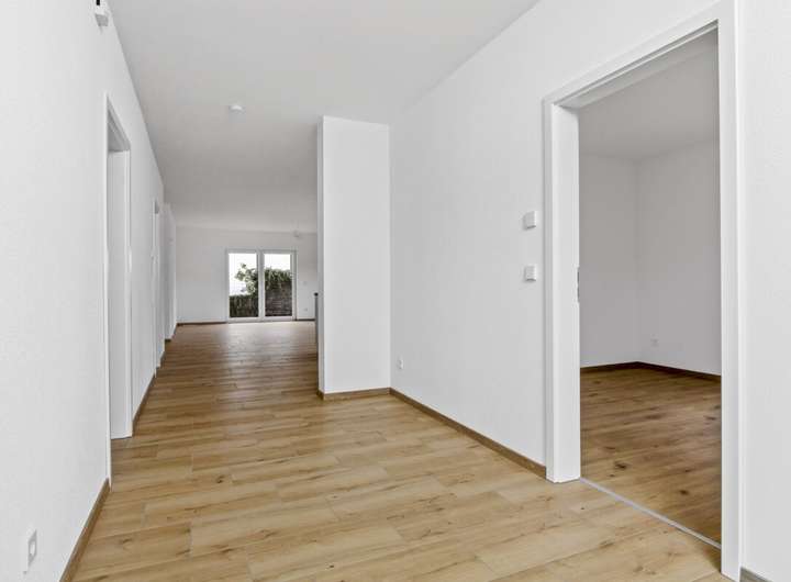 Im Wohnbereich ist Fliesenfußboden in Holzoptik verlegt, in den Nassbereichen ist der Fliesenboden grau. Schlafzimmer, Ankleidezimmer, und Büro/ Gästezimmer werden mit Laminat in Eiche ausgestattet. Für die Wärme sorgt eine Fußbodenheizung, betrieben über eine Wärmepumpe. Die Fenster wurden in dreifach-Verglasung ausgeführt, der Energieverbrauch entspricht somit dem modernsten Standard. Die Wände werden mit weiß gestrichener Raufasertapete übergeben. Die Räumlichkeiten sind mit elektrischen Rolläden zu verdunkeln.