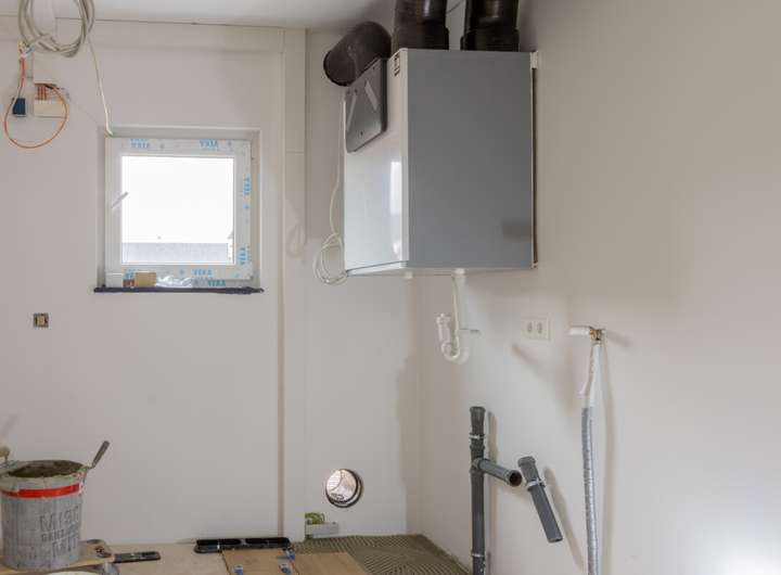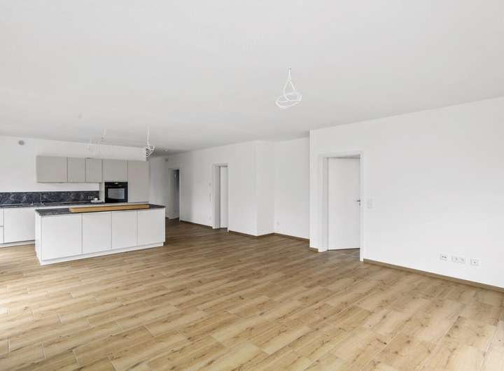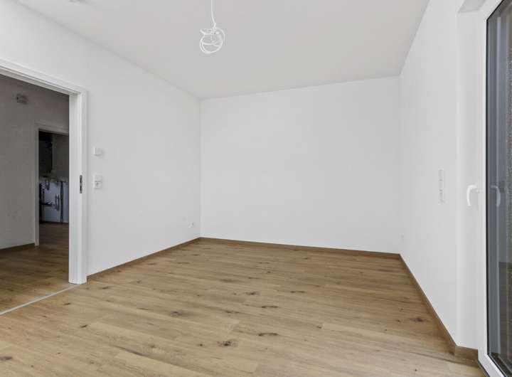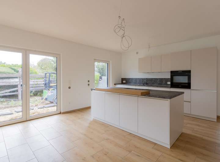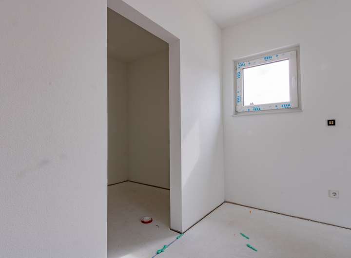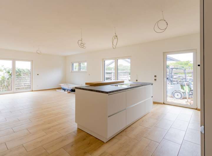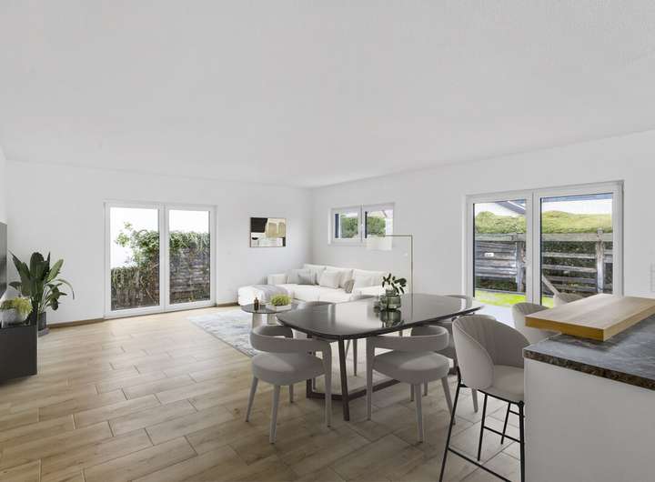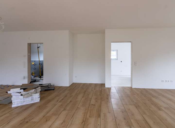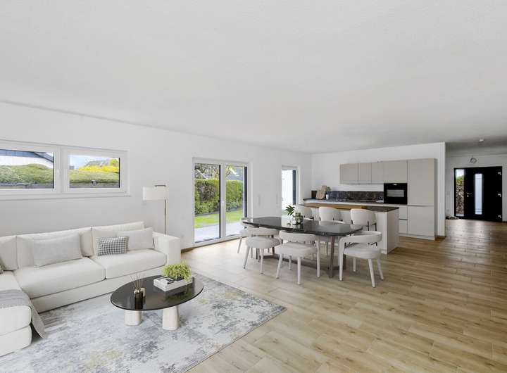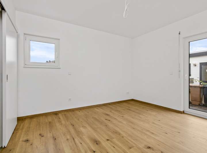 Im Wohnbereich ist Fliesenfußboden in Holzoptik verlegt, in den Nassbereichen ist der Fliesenboden grau. Schlafzimmer, Ankleidezimmer, und Büro/ Gästezimmer werden mit Laminat in Eiche ausgestattet. Für die Wärme sorgt eine Fußbodenheizung, betrieben über eine Wärmepumpe. Die Fenster wurden in dreifach-Verglasung ausgeführt, der Energieverbrauch entspricht somit dem modernsten Standard. Die Wände werden mit weiß gestrichener Raufasertapete übergeben. Die Räumlichkeiten sind mit elektrischen Rolläden zu verdunkeln.