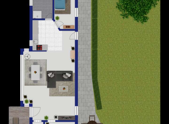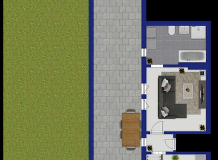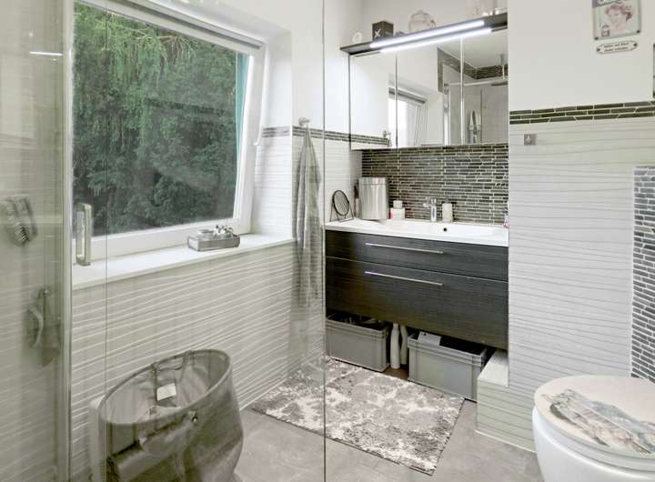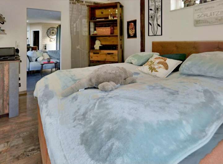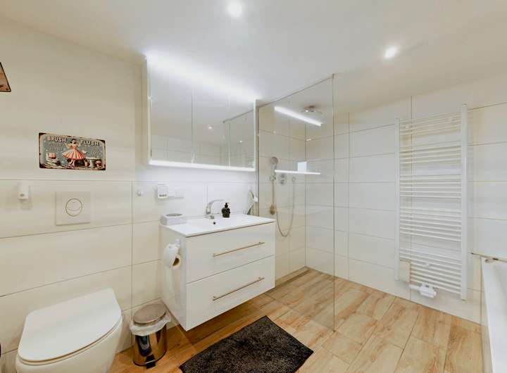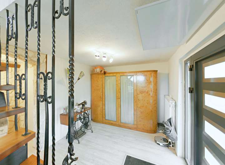 Das Haus selbst wurde in den letzten Jahren umfassend renoviert und modernisiert. Auf der Hauptebene erwarten Sie eine hochwertige Einbauküche mit offenem Wohn- und Essbereich, ein gemütliches Schlafzimmer, ein helles Büro und ein Badezimmer. Im Untergeschoss stehen Ihnen ein großzügiger Flur mit Abstellraum, ein weiteres Zimmer sowie ein modernes Bad mit Wanne zur Verfügung – ideal auch für Gäste oder als Rückzugsbereich.