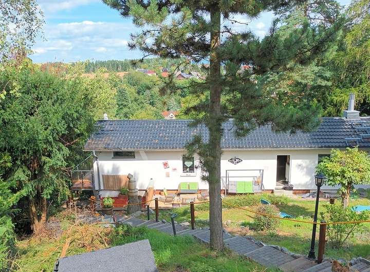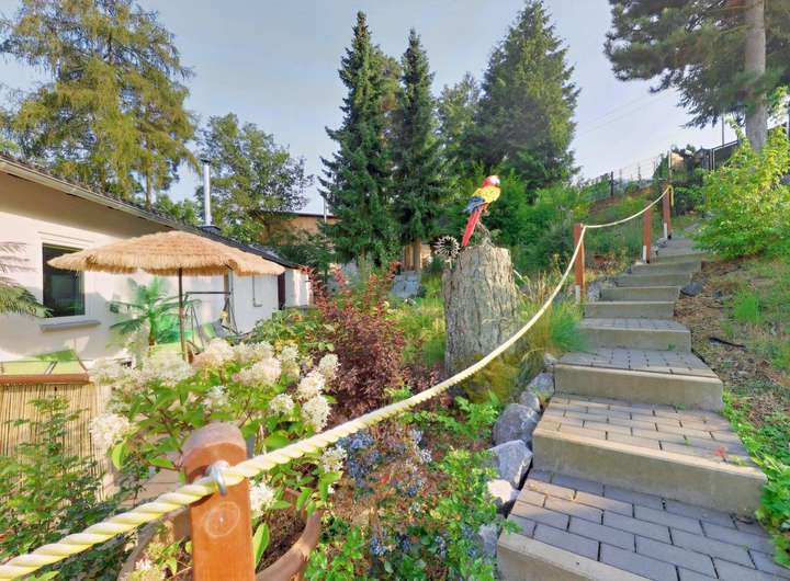 Der liebevoll gestaltete Garten in attraktiver Hanglage begeistert mit einer wunderschönen Aussicht und durchdachter Anlage. Ein echtes Kleinod, das zum Verweilen einlädt. Neben zwei Stellplätzen finden Sie hier eine Fahrradhütte, ein Gartenhaus mit WC und Übernachtungsmöglichkeit, einen großen Schuppen mit reichlich nicht einsehbarer Abstellfläche sowie eine Garage mit Holzlager. Dank der zwei Zugänge ist das Grundstück flexibel nutzbar.