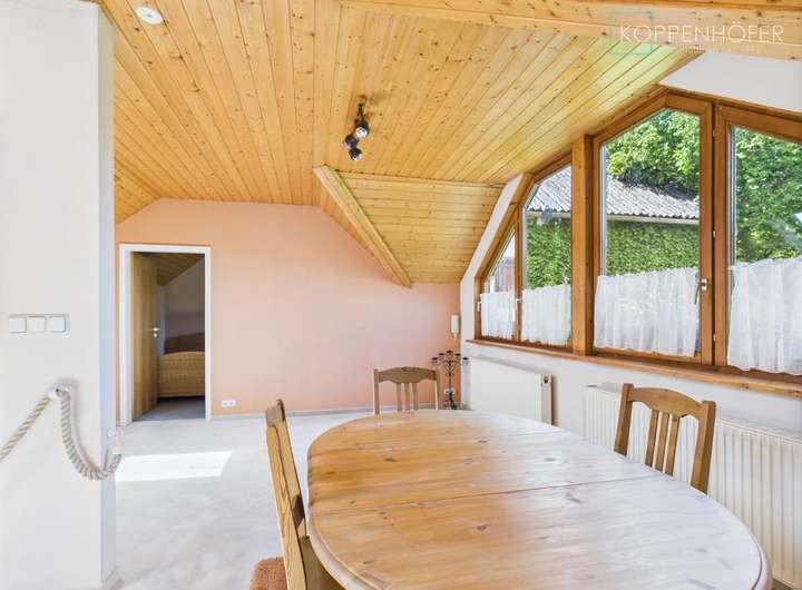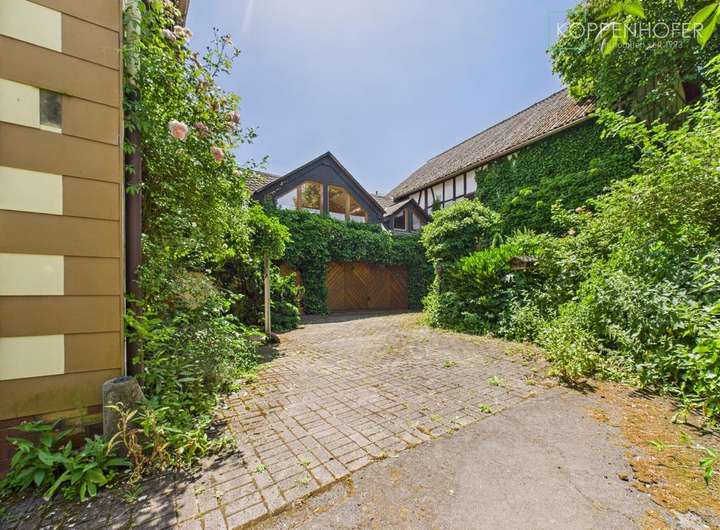 Direkt daneben befindet sich das zweite Gebäude, ein kompakter, moderner Anbau aus den 1990ern, der sich hervorragend als Einliegerwohnung, Büro oder Gästehaus eignet. Auf ca. 50 m² bietet es eine helle Wohnküche, einen gemütlichen Wohn- und Essbereich, Schlafzimmer sowie ein Badezimmer. Hier kann sofort gewohnt werden, während Sie das Hauptgebäude in Ruhe nach Ihren Vorstellungen gestalten. Darunter verbirgt sich die großzügige Doppelgarage mit elektrischen Tor. Ideal für Ihre Schätze oder andere Fortbewegungsmittel.
