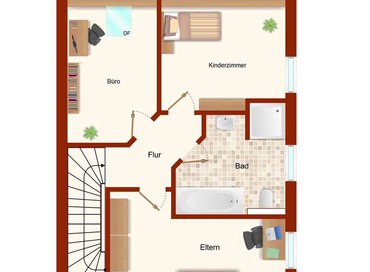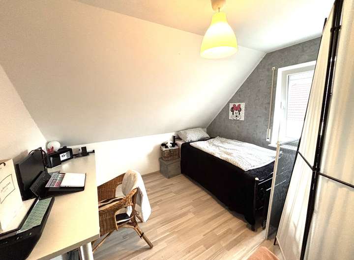 Im Obergeschoss stehen Ihnen insgesamt drei Zimmer zur Verfügung, die flexibel als Schlaf-, Kinder- oder Arbeitszimmer genutzt werden können. Ergänzt wird die Etage durch ein gepflegtes Vollbad sowie das Elternschlafzimmer.