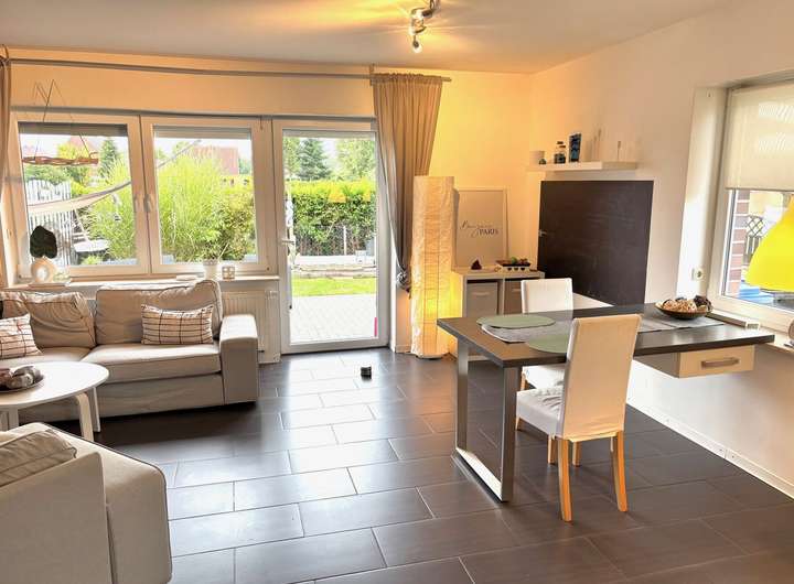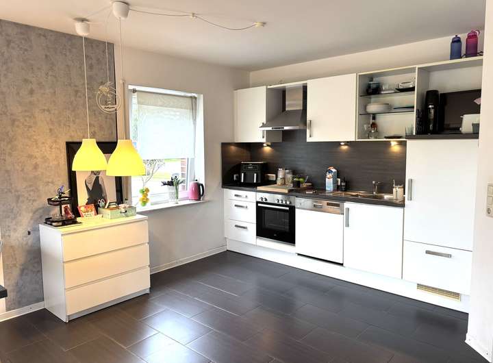 Diese gepflegte Doppelhaushälfte überzeugt durch ein wohnliches Ambiente und helle Wohnbereiche. Im Erdgeschoss befindet sich eine großzügige Wohnküche mit Ess- und Wohnbereich, die direkten Zugang zur eingezäunten Terrasse bietet. Ein Gäste-WC, ein Abstellraum und ein Anschlussraum runden diese Ebene ab.