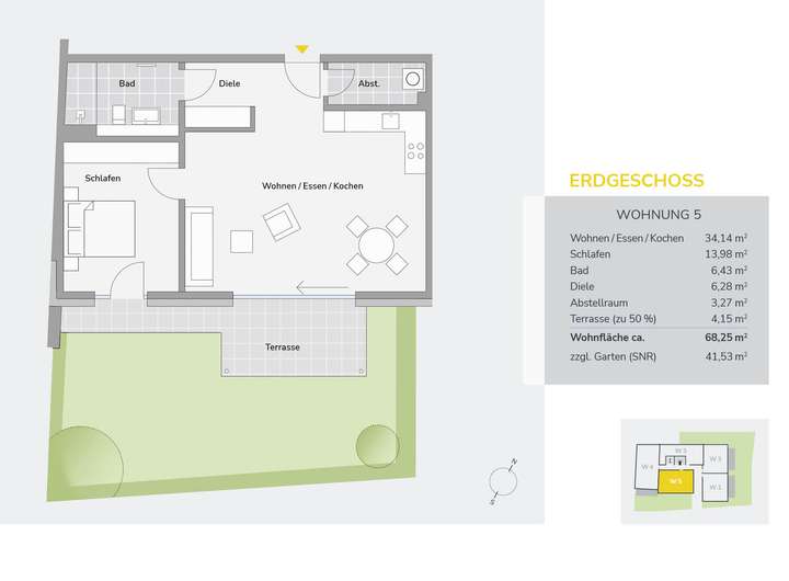 Die Wohnung überzeugt mit einem funktionalen Grundriss, der den Wohn- und Essbereich mit der offenen Küche verbindet. Die große, bodentiefe Hebe-Schiebetüre sorgt für viel Tageslicht. Angegliedert an den Wohnraum findet sich die Süd-Terrasse mit kleinem Privatgarten, der als Sondernutzungsrecht zur Wohnung gehört. Hier genießen Bewohner ruhige Stunden zum Innenhof hin und zusätzlichen Raum zur individuellen Gestaltung.