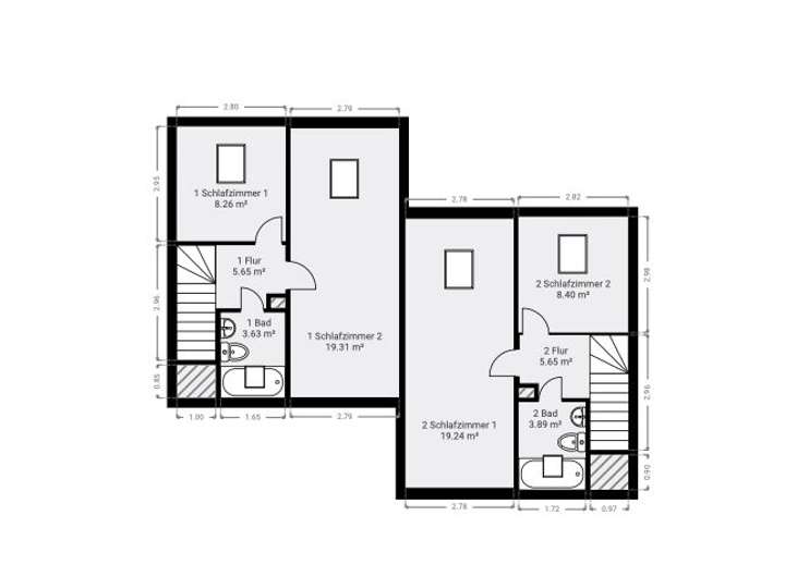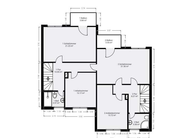 Die oberen Etagen sind über zwei separate Treppenaufgänge erreichbar. Vier geräumige Zimmer, davon zwei mit Balkon, sowie zwei helle Tageslichtbäder bieten komfortables Wohnen für alle Familienmitglieder.